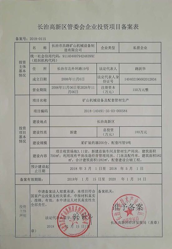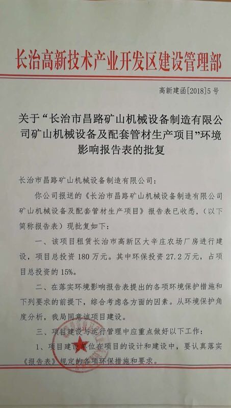 關(guān)于“長治市昌路礦山機械設(shè)備制造有限公司礦山機械設(shè)備及配套管材生產(chǎn)項目”環(huán)境影響報告表的批復
