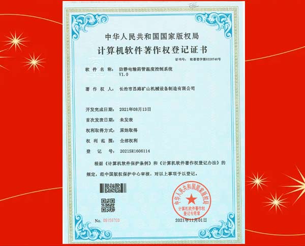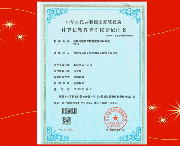 榮獲裝藥器生產控制平臺著作權登記證書