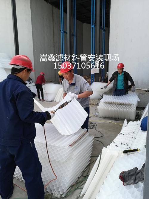 1、打開斜管填料包裝,將第一片斜管填料平放于地面,取第二片斜管填料置于第一片填料之上,檢查斜管填料的切口,必須保證60°角、并呈六角蜂窩狀,檢查無誤后開始燙接粘接點(diǎn);